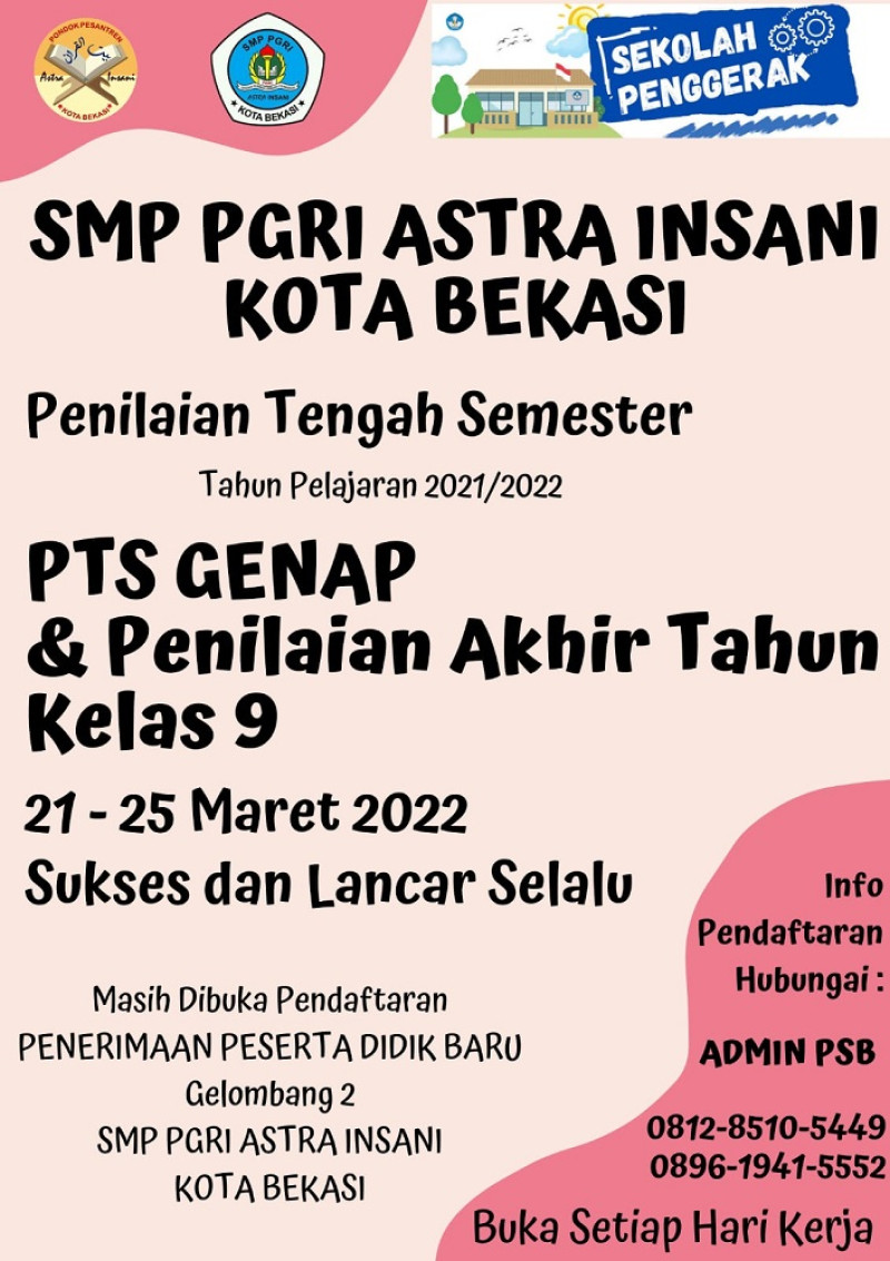 Sesuai Kalender Pendidikan, bahwa setelah kegiatan Pembelajaran berjalan selama 8 atau 9 Minggu, maka harus diadakan kegiatan Penilaian Tengah Semester (PTS). Demikian juga SMP PGRI Astra Insai akan mengadakan Kegiatan PTS terhitung mulai Hari Senin, tanggal 21 Maret 2022 sampai dengan 24 Maret 2022.